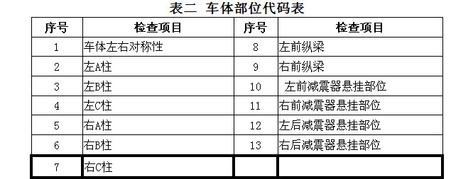 A、参照图二所示车体部位,按照表二要求检查车辆外观,判别车辆是否发生过碰撞、火烧,确定车体结构是完好无损或者有事故痕迹;使用漆面厚度检测设备配合对车体结构部件进行检测;使用车辆结构尺寸检测工具或设备检测车体左右对称性。