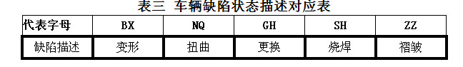 B、根据表二、表三对车体状态进行缺陷描述。即:车身部位+状态。例:4SH,即:左C柱有烧焊痕迹。