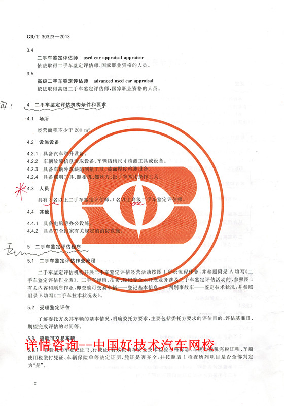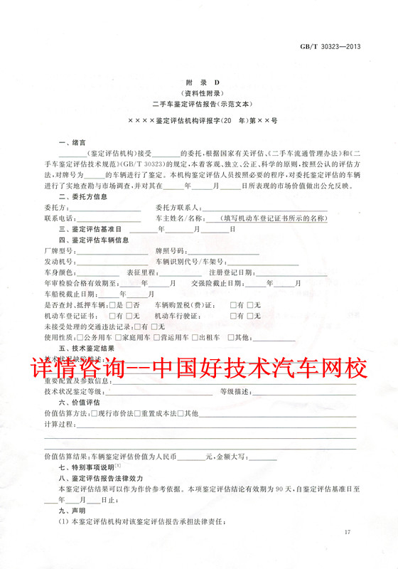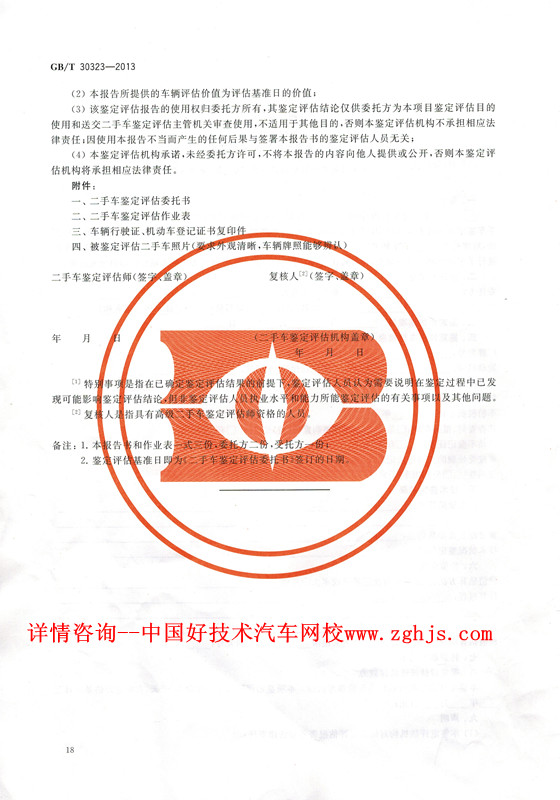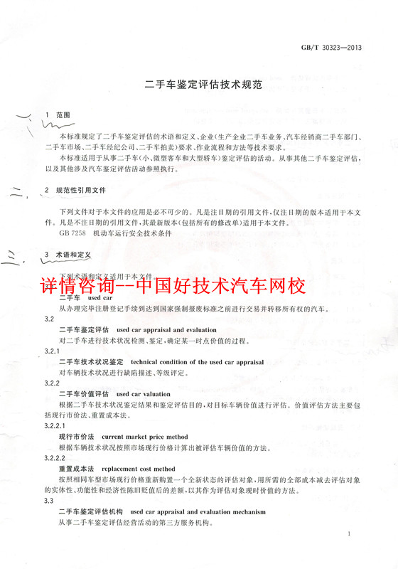 以上是中国好技术汽车网校技术研发部 为大家整理收集的2014年6月1日即将实施的《二手车鉴定评估技术规范》内容,本规范是国家第一部法律层面对二手车交易评估业的规范制度,拟将二手车行业规范为:正规守信、透明阳光的支柱产业,望各位学员积极学习、不断改变、顺应市场,凡是没有考取《二手车鉴定评估师》职业资格证书的学员,应尽快考取。随着国家对二手车行业的不断规范和治理,此资质资格证书将会越来越难考,价格越来越贵,请尽快与本校老师联系考取。